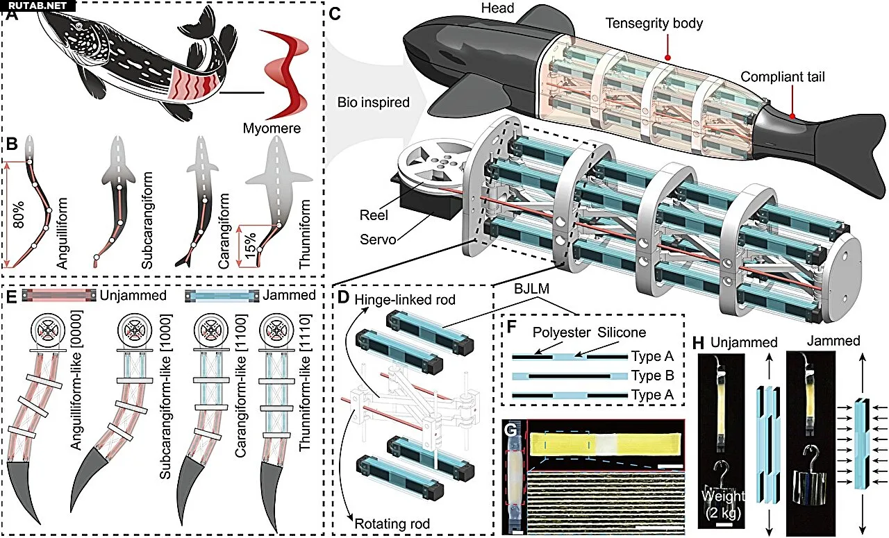 Рыбы используют волнообразные движения тела для плавания, но задействованная в этом процессе часть тела варьируется у разных видов. Угреподобные рыбы изгибают большую часть своего тела, что обеспечивает высокую манёвренность, но ограничивает скорость, в то время как тунцеподобные пловцы концентрируют движение возле хвоста, чтобы достичь быстрого и эффективного крейсерского движения. Прямое тестирование того, как жёсткость и распространение волны управляют этими различиями, было затруднительно как на живых животных, так и на предыдущих роботизированных моделях. Чтобы решить эту задачу, команда PKU разработала переконфигурируемую модульную мягкую роборыбу с контролируемой жёсткостью тела.