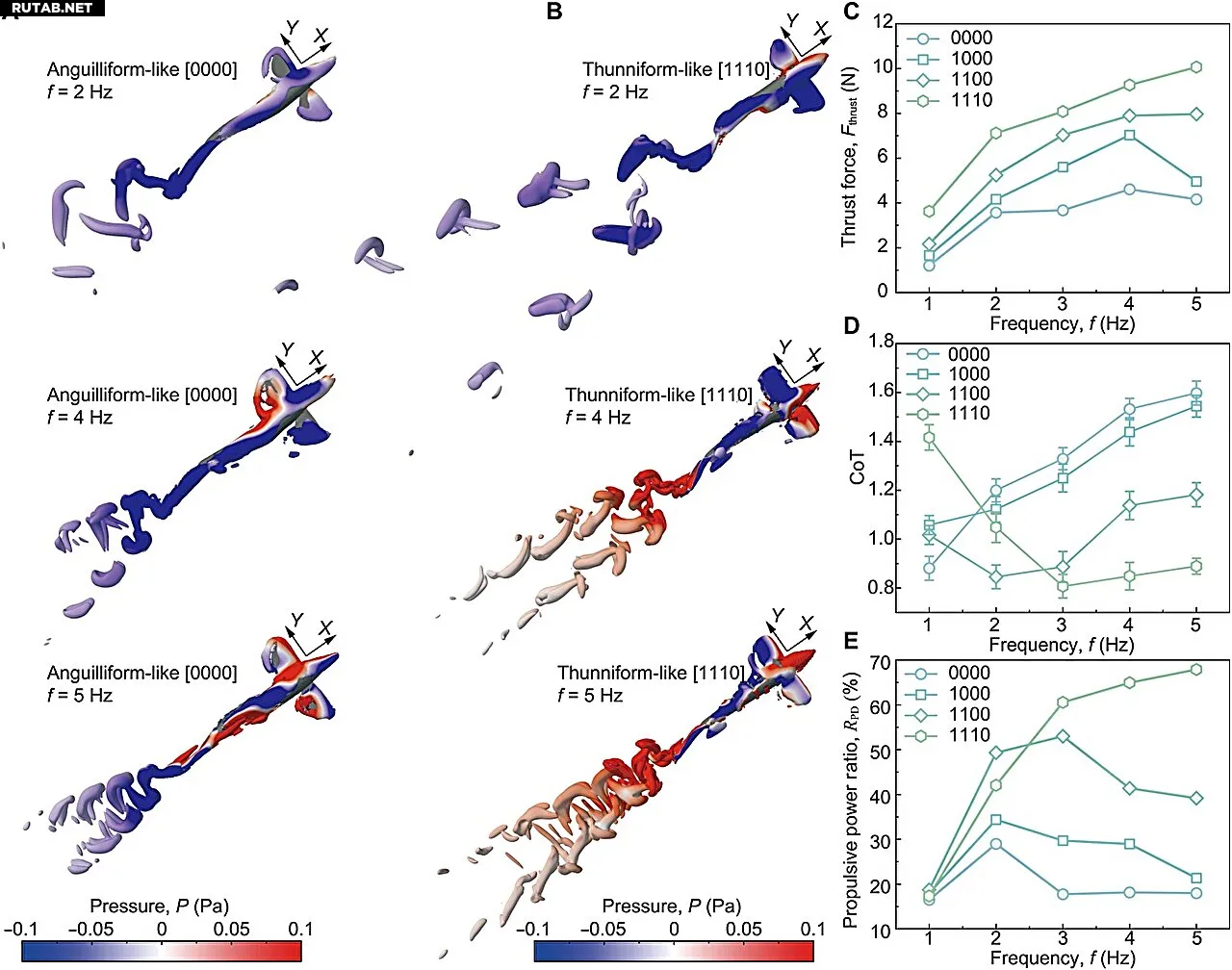 В высокожёстком тунцеподобном режиме эффективная передача волны с длинами волн 0,75–1,05 длины тела поддерживалась на высоких частотах, что обеспечивало большее тяговое усилие. Вычислительное моделирование гидродинамики показало, что этот режим генерировал сильные, когерентные вихревые кольца на хвосте, тогда как угреподобный режим создавал фрагментированные следы и более высокое сопротивление возле головы. При 5 Гц тяга в тунцеподобном режиме была на 142% выше, в то время как угреподобный режим продемонстрировал превосходную манёвренность с минимальным радиусом поворота 0,26 длины тела.