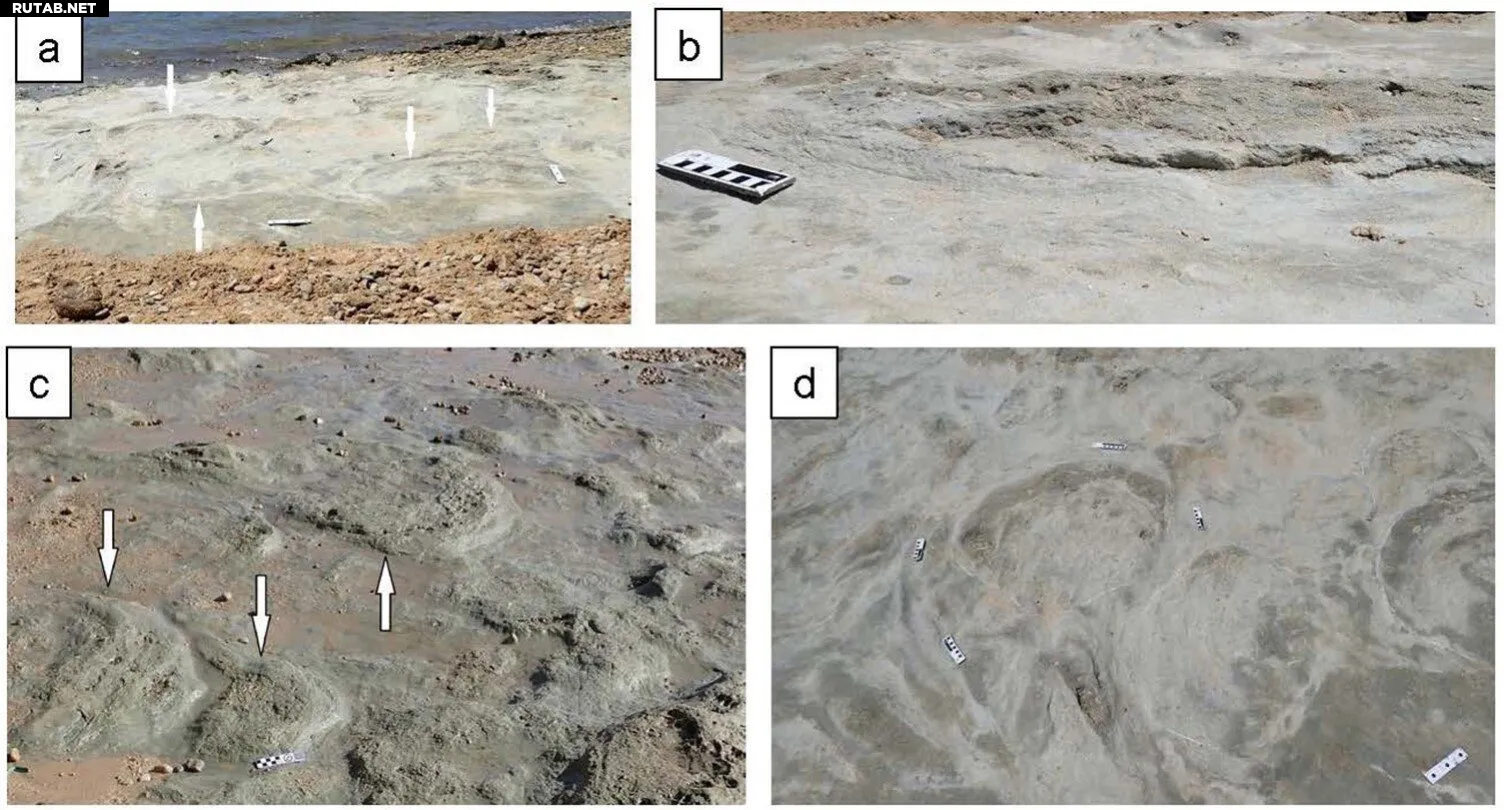 (a) Стрелки указывают на возможные следы завропода рядом с устьем реки. (b) В профиль видна слабая вогнутая деформация в нижележащих слоях. (c) Стрелки указывают на возможные следы завропода. (d) Следы слегка обведены белым мелом. Все масштабные линейки = 10 см. Автор: South African Journal of Science (2026). DOI: 10.17159/sajs.2026/22809
