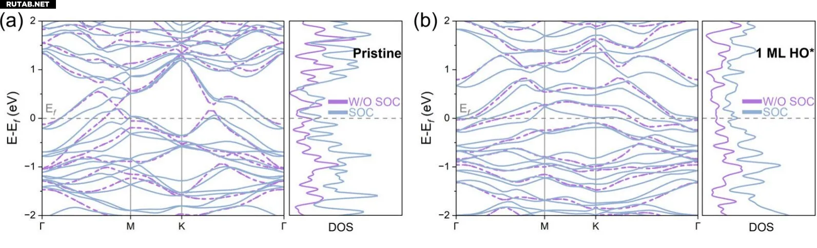 Определение топологических поверхностных состояний монослоя PtBi2. Зонная структура и полная плотность состояний (DOS) монослоя PtBi2 с различными ESS: (a) чистая поверхность и (b) 1 монослой HO*. Фиолетовые и голубые линии обозначают результаты без учёта и с учётом SOC соответственно. Уровень Ферми смещён к 0 эВ. Автор: The Journal of Physical Chemistry Letters (2025). DOI: 10.1021/acs.jpclett.5c03589