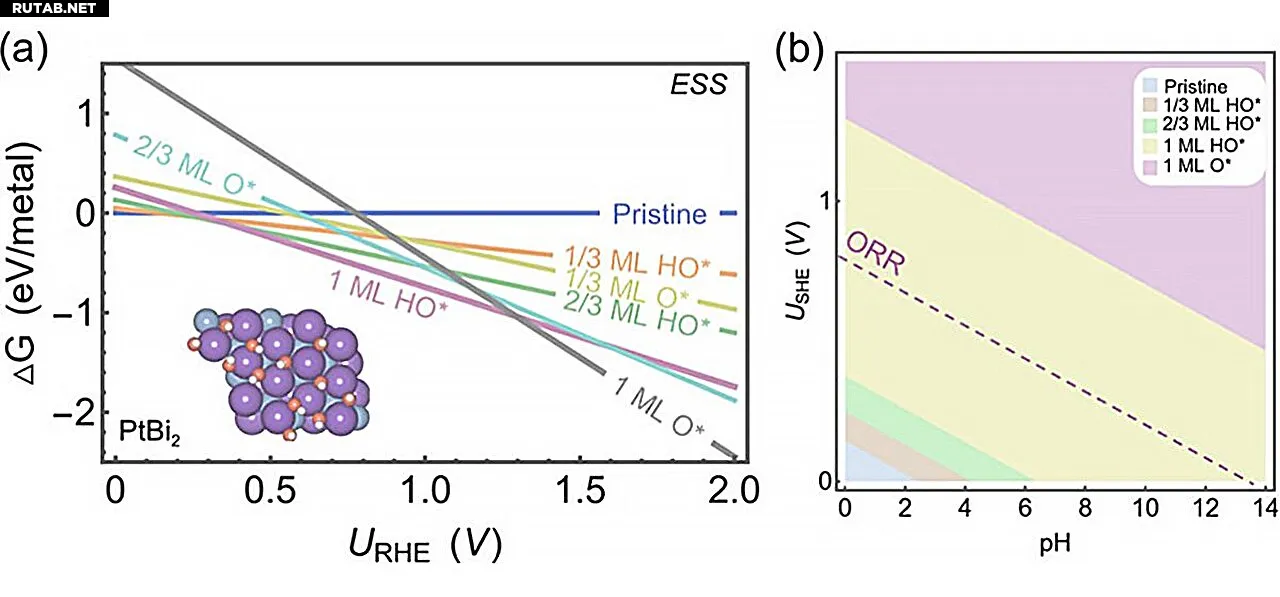 Явно учитывая эффекты pH, исследователи также предсказали, что PtBi₂ достигает почти пиковой активности ORR в щелочных средах. Это подчёркивает важность оценки каталитической производительности в реалистичных электрохимических условиях, а не опоры на идеализированные модели поверхностей.