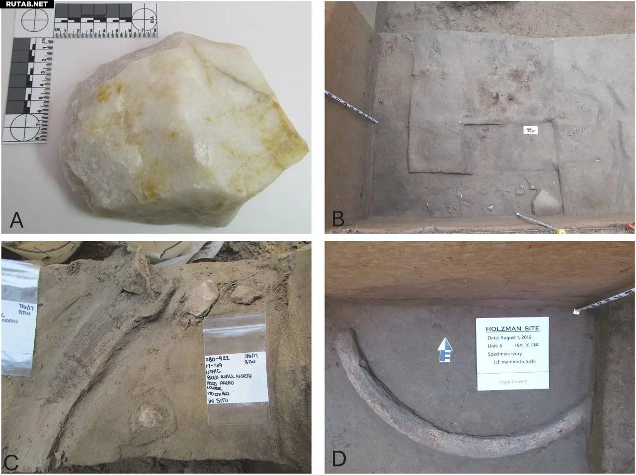 Раскопки на стоянке Хольцман в долине Танана на Аляске предоставили новые данные о первых людях, прибывших в Северную Америку. Исследователи обнаружили свидетельства повторяющейся человеческой активности около 14 000 лет назад, включая остатки костров, кости животных, каменные орудия и почти целый бивень мамонта.