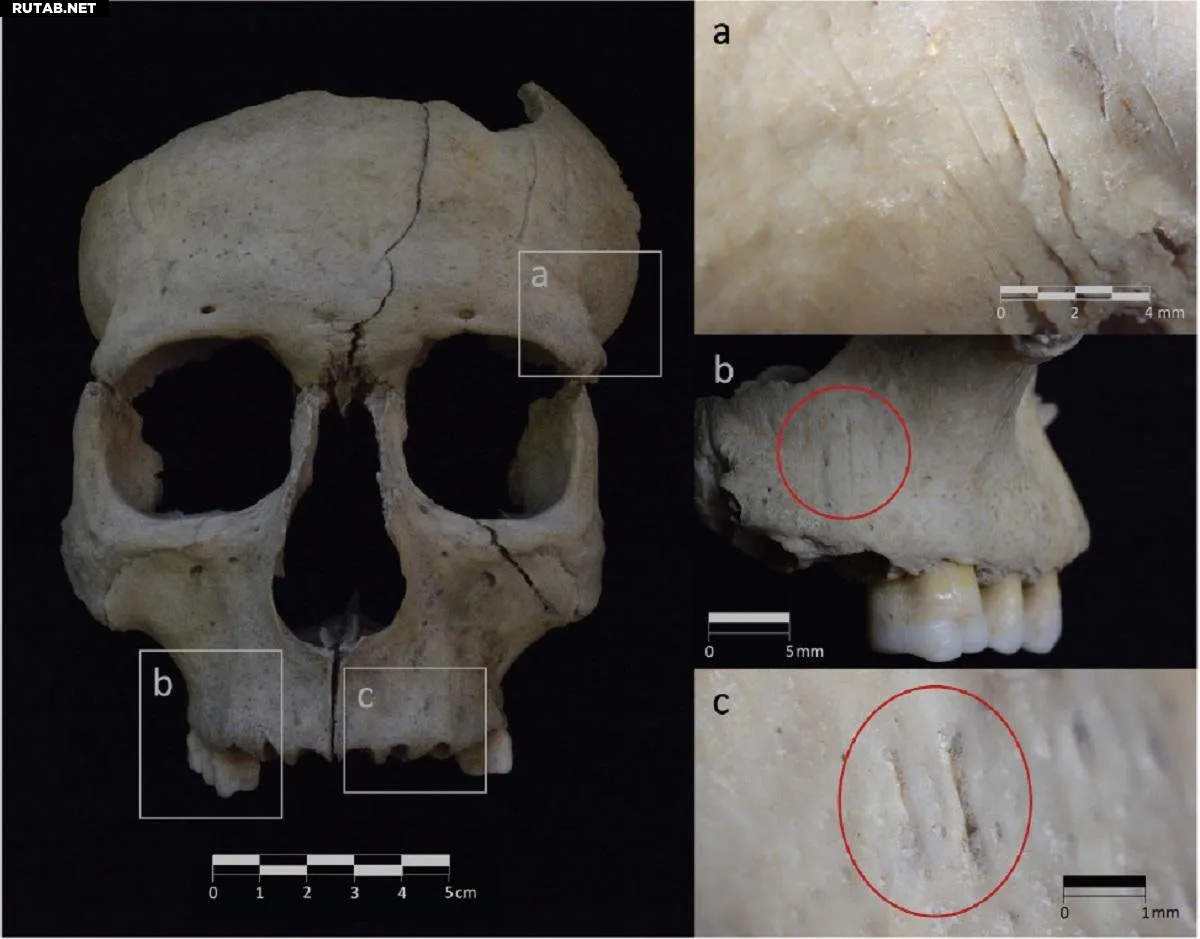 Тонкие насечки на лбу и челюсти соответствуют тонким металлическим инструментам, похожим на иглы, найденным на других иберских стоянках, связанных с выставлением голов. Эти следы указывают на удаление мягких тканей, включая части лица. Схожая обработка известна в контекстах железного века во Франции и Британии, что подтверждает ритуальную подготовку, а не просто случайное насилие.