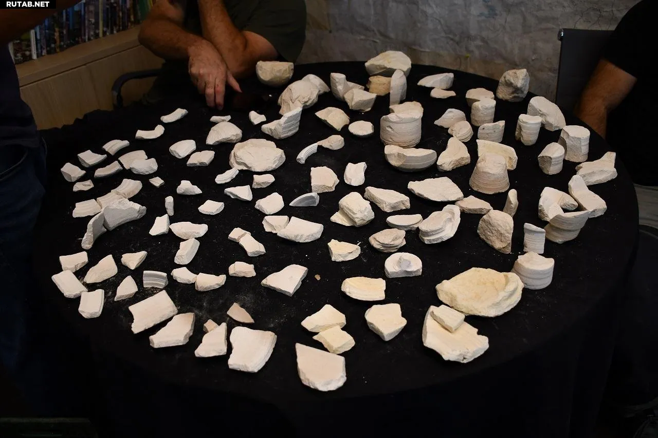 После того как территория была взята под охрану, инспекторы вошли в пещеру. Пол был усыпан сотнями фрагментов, сделанных из мелового известняка. Рядом с кучами каменной крошки лежали обломки сосудов и несколько незаконченных изделий. Находки указывают на крупномасштабное производство, существовавшее около 2000 лет назад, в поздний период Второго Храма.