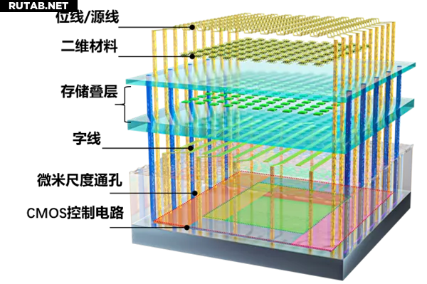 二维-硅基混合架构闪存芯片结构示意图,包含二维模块、CMOS控制电路和微米尺度通孔