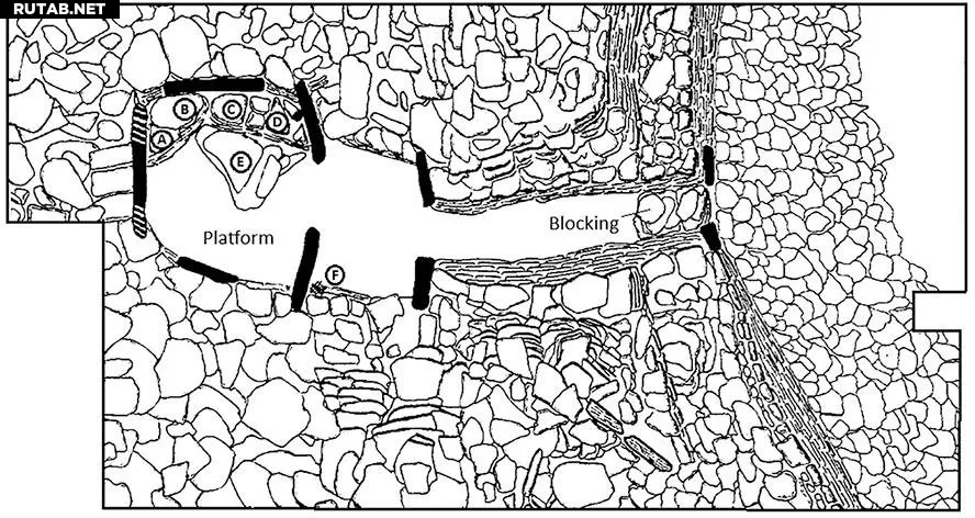План северной камеры гробницы Таллох-оф-Ассери А в Кейтнессе, показывающий расположение групп костей A–F. Авторы, по Corcoran 1967 / Antiquity