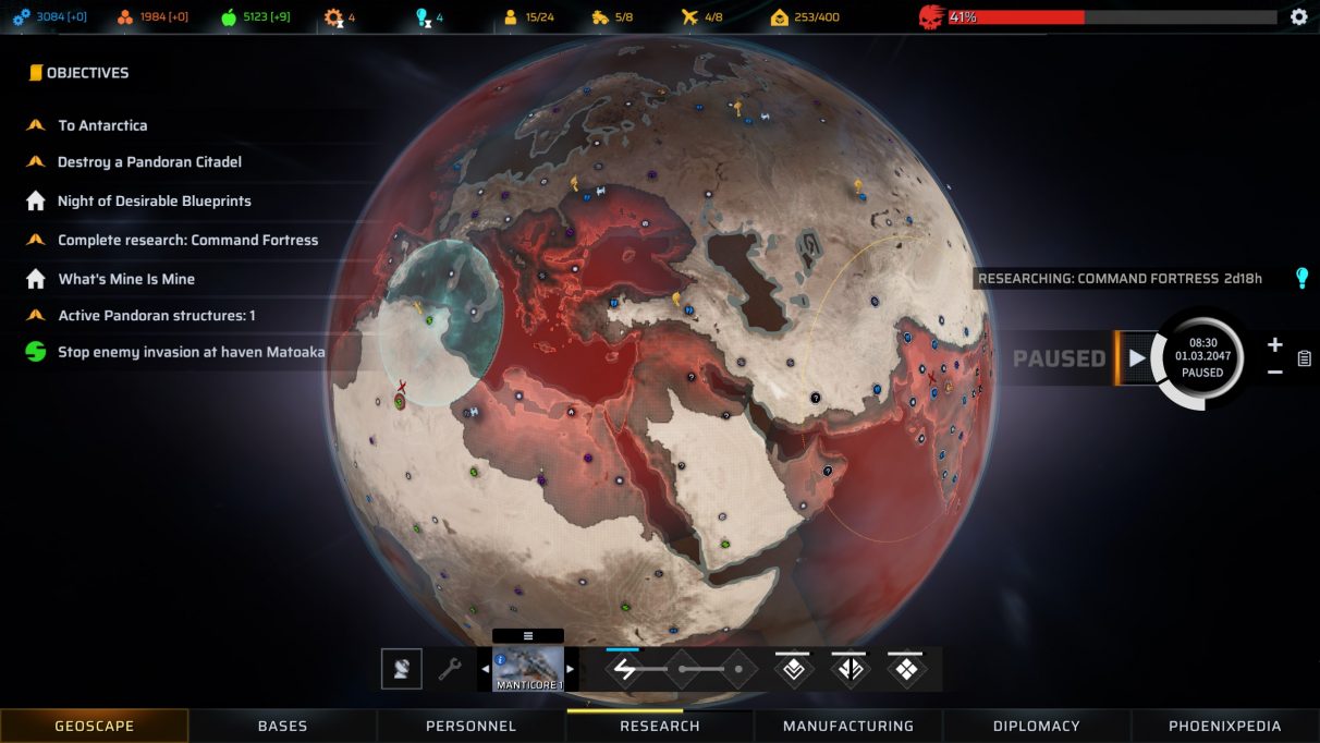 Геоскоп — масштабная тактическая карта, мало чем отличающаяся от такой же в XCOM. Именно на ней вы будете выбирать следующие задания, проматывать время, видеть статус исследований и так далее.