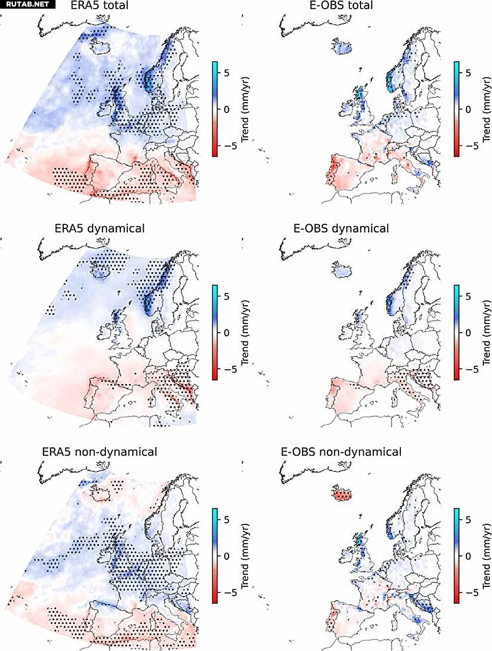 Наблюдаемые тенденции с 1950 по 2024 год в общих, динамических и нединамических зимних осадках для европейского региона по данным ERA5 и E-OBS. Точечный узор указывает на значимость на 90-м доверительном интервале, рассчитанном с помощью бутстреп-ресемплинга. Автор: Environmental Research Letters (2025). DOI: 10.1088/1748-9326/ae198b
