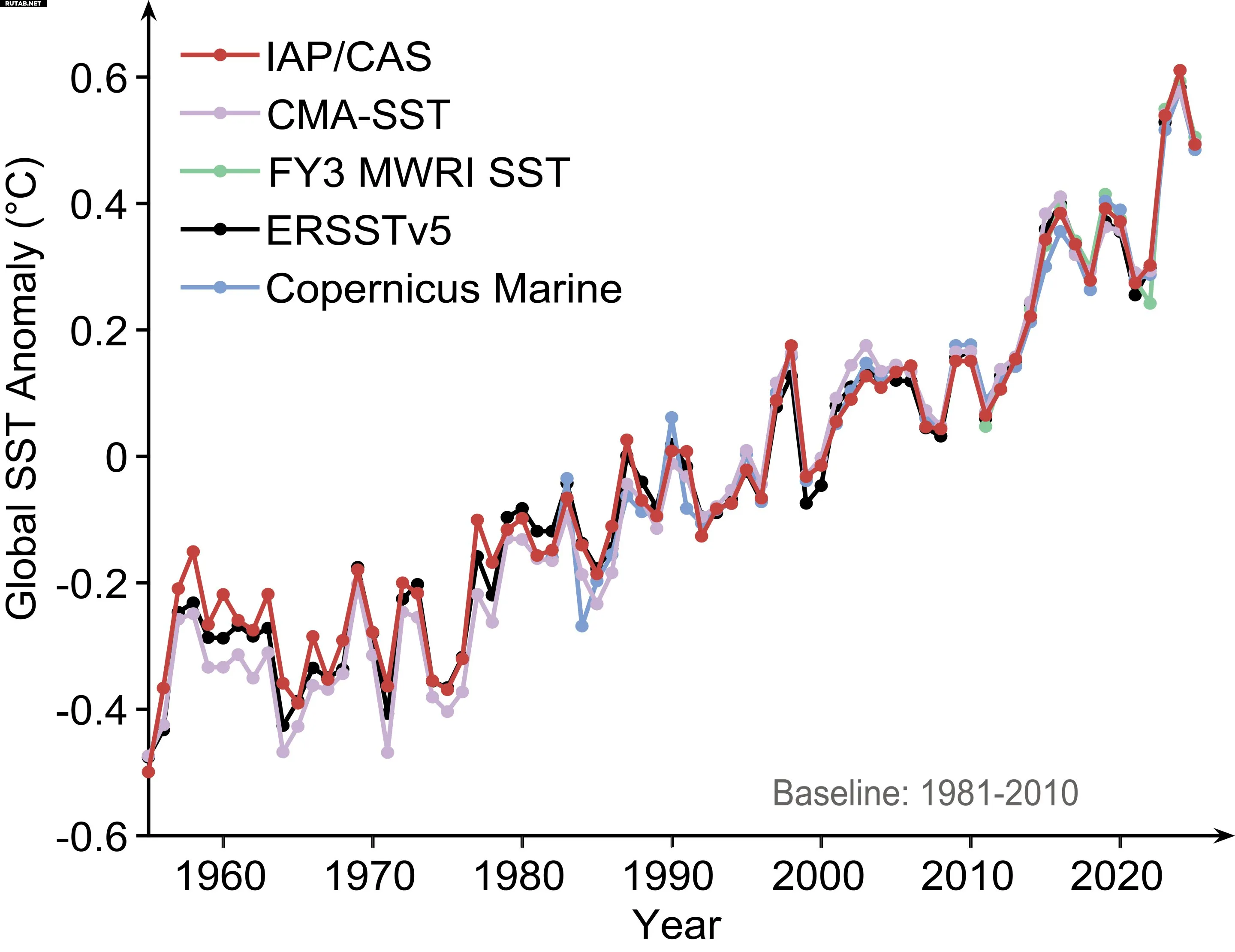 Изменение температуры поверхности глобального океана с 1958 года. Автор: Pan et al.