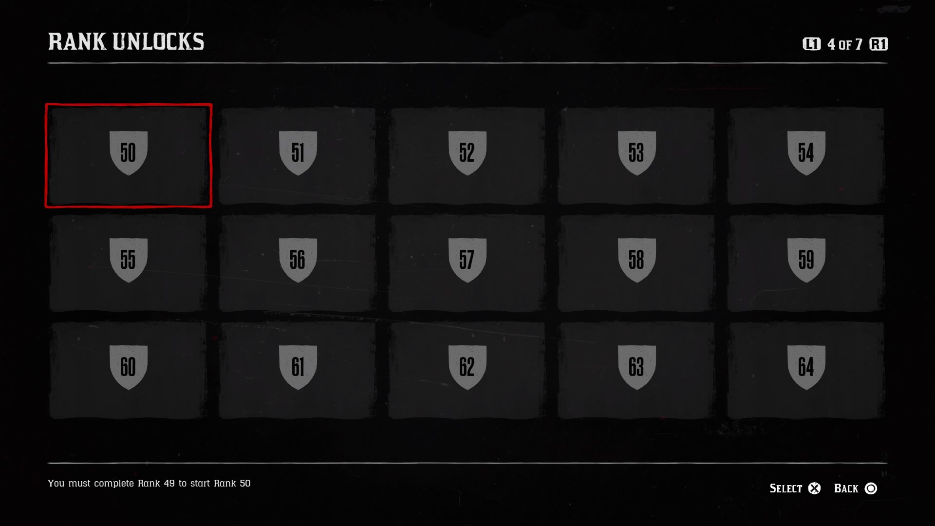 Зайдя в раздел «Прогресс» из главного меню и выбрав пункт «Разблокировка ранга», вы сможете посмотреть что разблокируете с каждым новым рангом Red Dead Online.