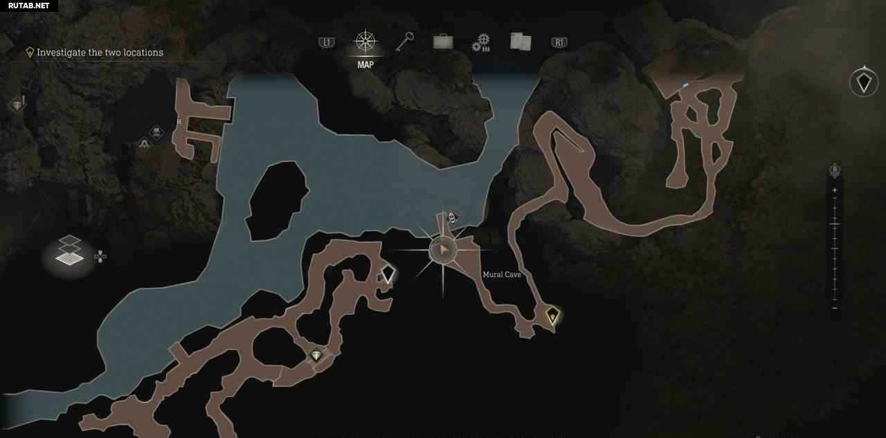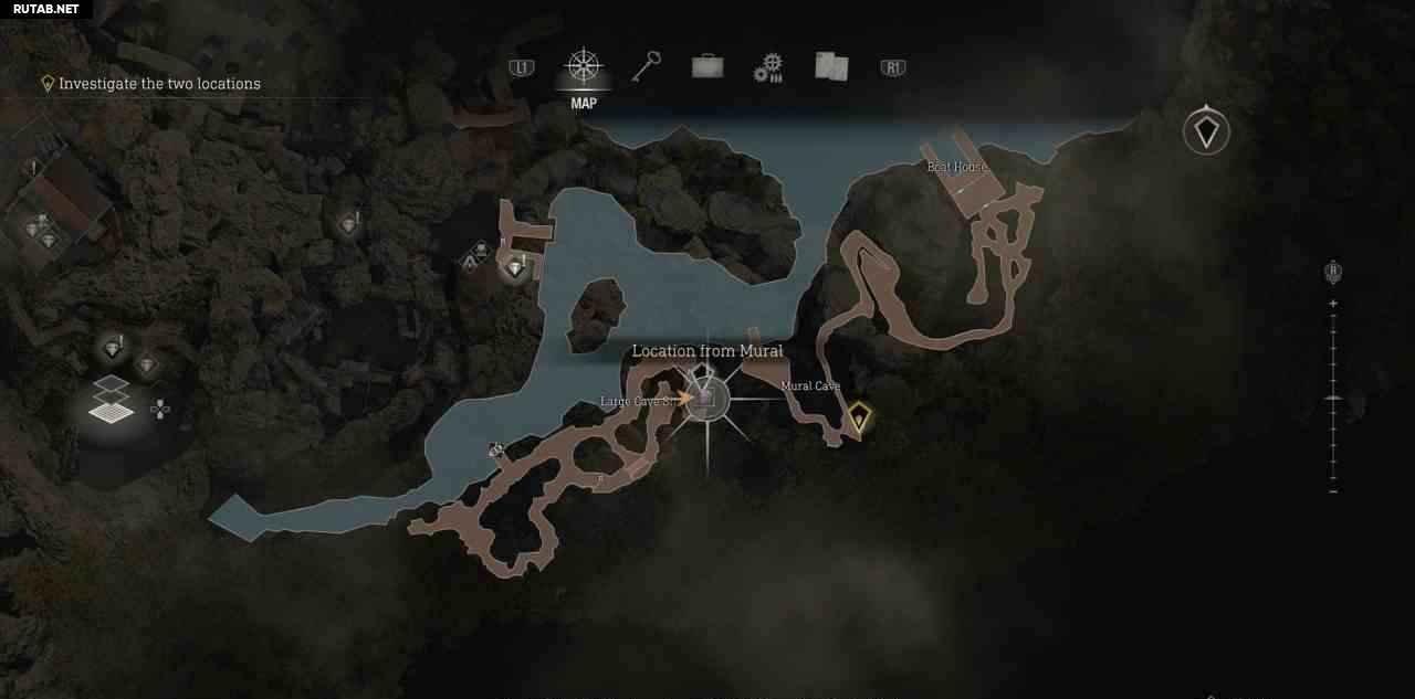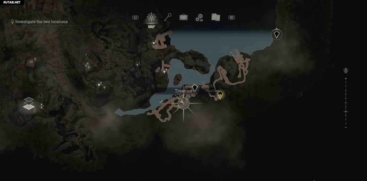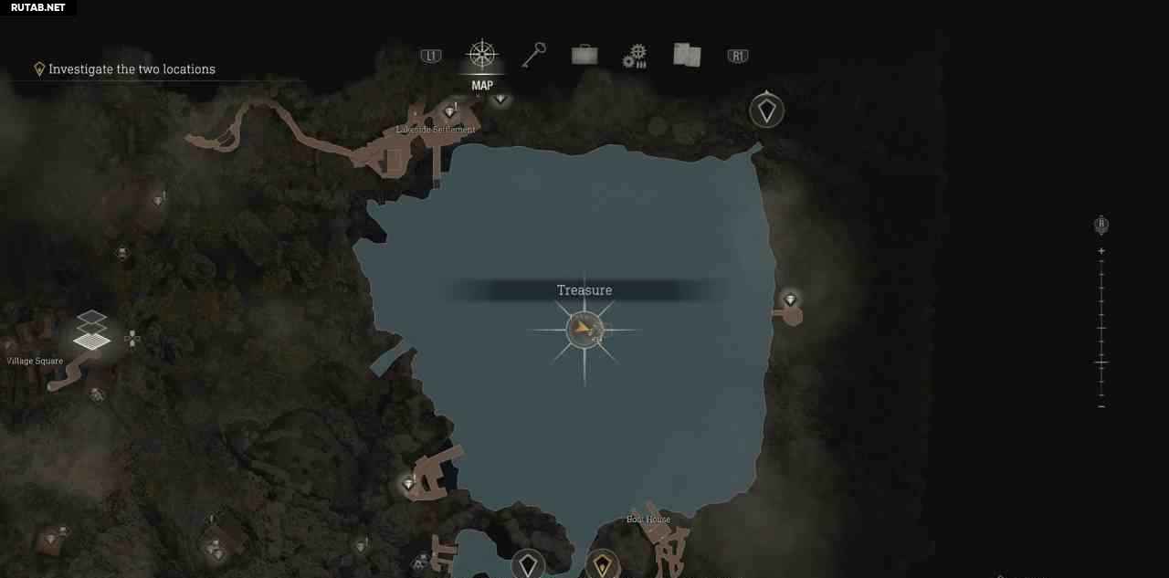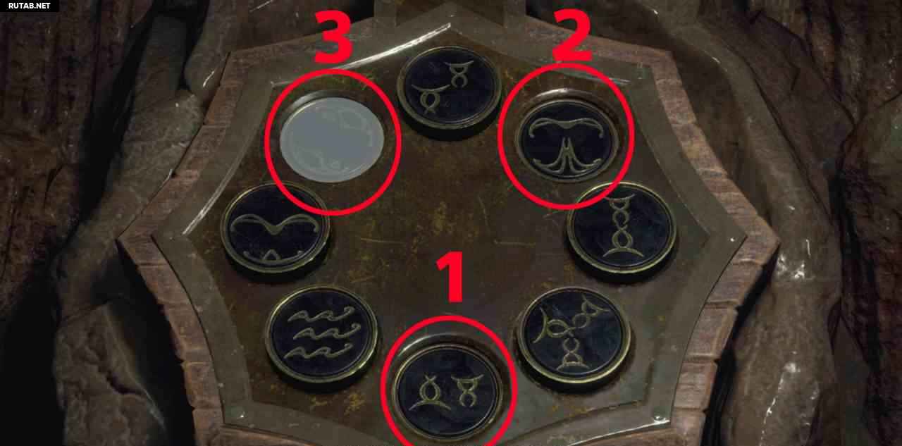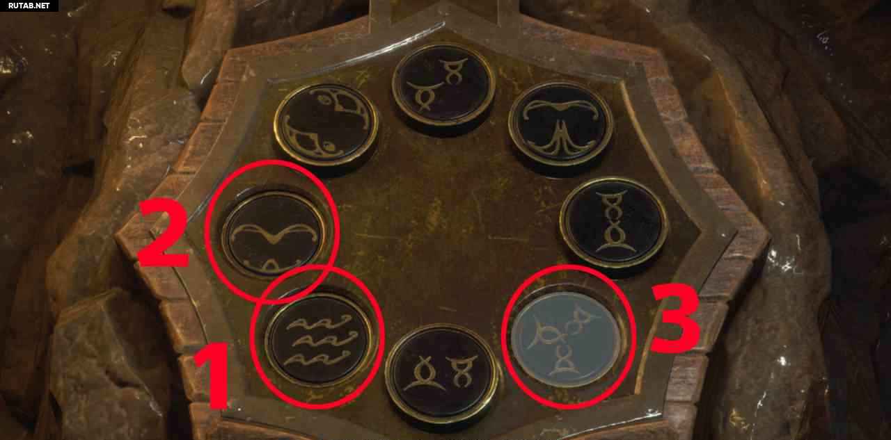 Ведите лодку в самый северо-восточный угол озера и пришвартуйте ее в пещере. Взаимодействуйте с консолью у запертой двери и нажмите 3 правильных значка (см. изображение ниже). За ним подберите ключевой предмет. Следующее сокровище тоже здесь.
