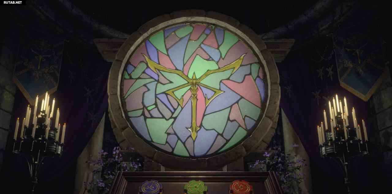 Внутри церкви справа, на полке. Получив его, потяните рычаг слева от алтаря, затем вставьте синий циферблат в алтарь. Затем вы должны вращать синее, зеленое и красное стекло вокруг крыльев существа таким образом, чтобы все цветные стекла заполняли всю площадь, но не перекрывали друг друга (изображение ниже).