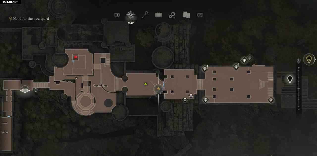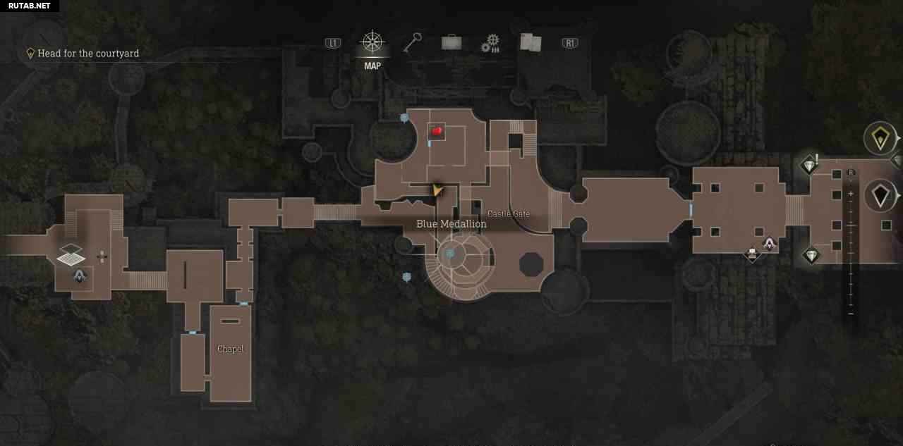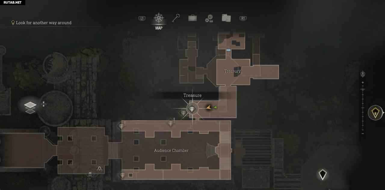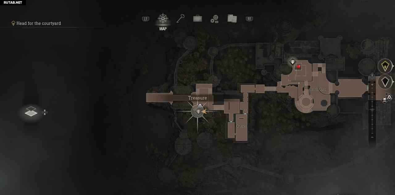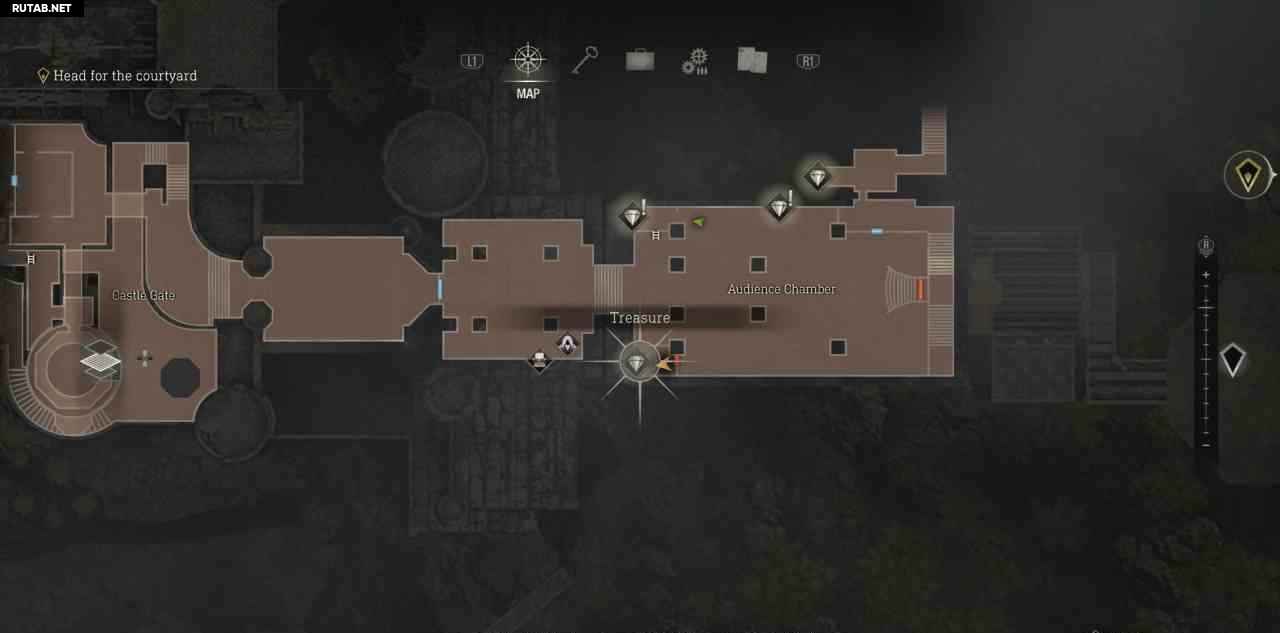 В самом начале замка войдите в первую дверь справа, чтобы найти торговца. Купите у него карту сокровищ замка, она помечает все сокровища на карте и добавляет счетчик прогресса в правом нижнем углу карты.