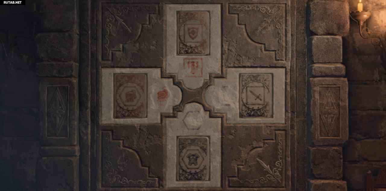 Внутри переплетной мастерской возьмите 3 камня и вставьте их в дверь в той же комнате и поместите камни, как показано на рисунке ниже. Обратите внимание, что вы должны поместить правильный камень в правильный слот. У каждого камня есть 2 значка с синим или оранжевым значком и квадратом или шестиугольником вокруг него. Сопоставьте каждый значок с правильным цветом и квадратом или шестиугольником вокруг него. Слева = оранжевый шлем в шестиугольнике/вверху = оранжевый щит в квадрате/справа = синий меч в квадрате/внизу = синяя броня в шестиугольнике.