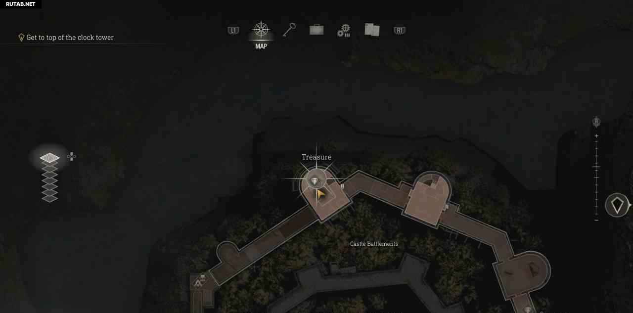 Когда вы вернетесь наружу и доберетесь до вершины стен замка, великан будет бросать в вас камни (большой огр). Здесь спрыгните с ПРАВОЙ стороны башни, к западу от карты. Войдите во 2-ю башню на западе. На крыше обойдите башню, чтобы найти кастеляна в конце.