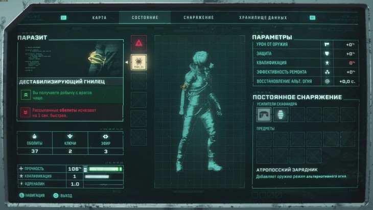 Вся текущая статистика. Урон, здоровье, паразиты и тд. Постоянное снаряжение не теряется после смерти. Здесь обычно сюжетные предметы. Паразиты дают положительные эффекты и отрицательные. Так что вам нужно выбирать между минусами и плюсами.