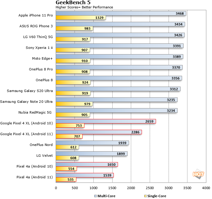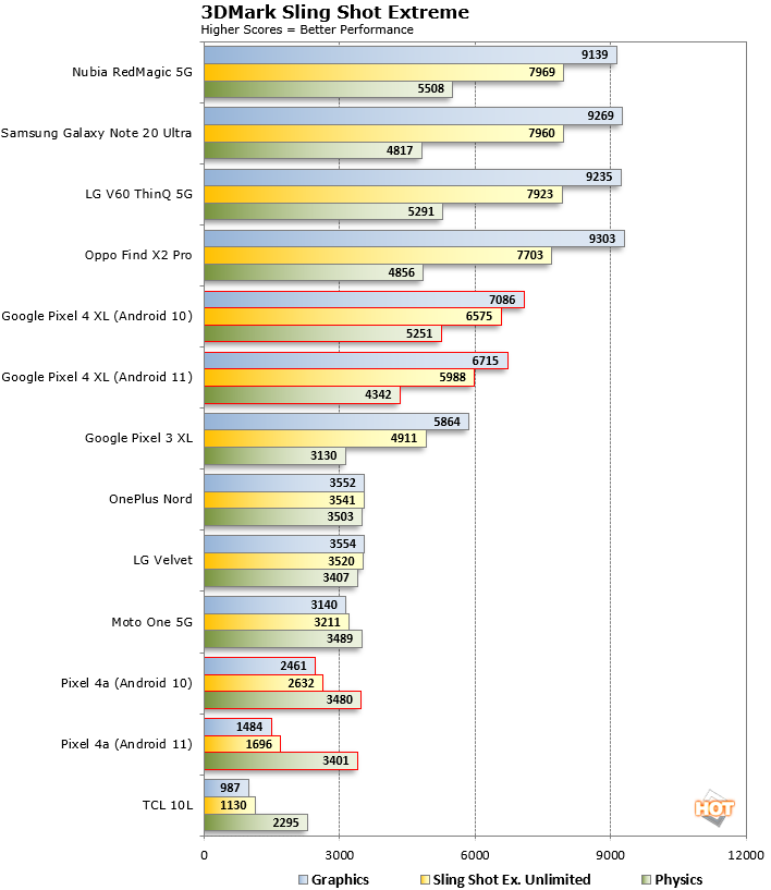 В 3DMark Sling Shot Extreme мобильный телефон Pixel 4 XL с Android 11 показал 9-процентное снижение производительности в сравнении с Android 10, а общая оценка Pixel 4a упала на 33%. Вместе с тем в тестах графики GFXBench T Rex Offscreen и GFXBench Manhattan Offscreen ES 3.0 (FPS) — значительно «провалился» Pixel 4a, а Pixel 4 XL показал одинаковые итоги.