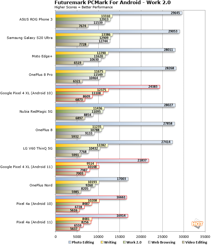 Чтобы определить, как повлияет установка Android 11 на выполнении стандартных сценариев использования устройств (просмотр веб-страниц, рендеринг видео), было проведено тестирование в PCMark Work 2.0. Невзирая на заметное снижение производительности Pixel 4 XL, Pixel 4a показал небольшое увеличение возможностей редактирования фотографий, а общая оценка в бенчмарке при использовании Android 11 в сравнении с предыдущей версией ОС оказалась выше.