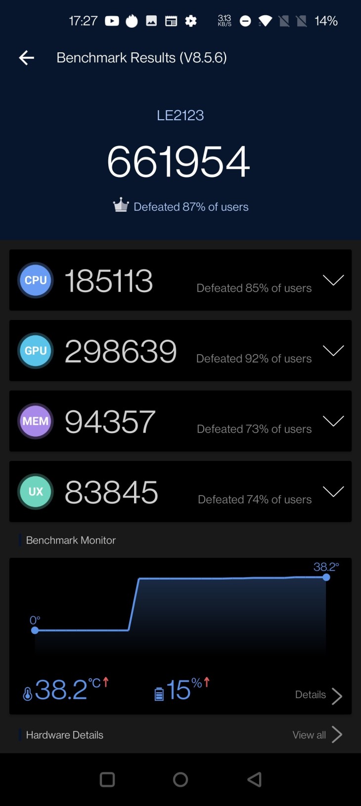 По результатам испытания в синтетическом бенчмарке OnePlus 9 Pro набрал 661 954 балла. Вместе с тем производительность процессора, графического ускорителя и оперативной памяти модели бенчмарк оценил в 185 113, 298 639 и 94 357 «попугаев» соответственно. Ещё 83 845 баллов пришлось на скорость работы пользовательского интерфейса.