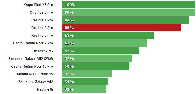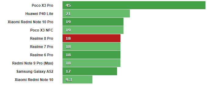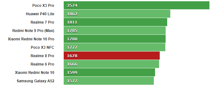 Общий балл AnTuTu также говорит о том, что Realme 8 Pro такой же мощный, как и многие его аналоги среднего уровня, но есть и лучшие телефоны по той же цене.