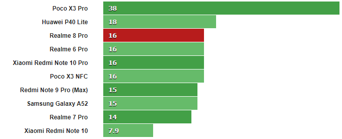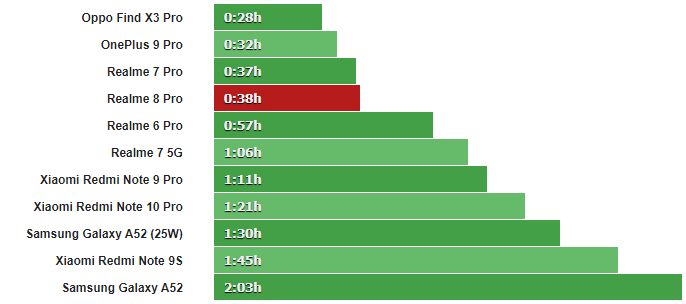↑Realme 8 Pro имеет много общего с Realme 7 Pro - аккумулятор емкостью 4500 мАч, тот же 6,4-дюймовый AMOLED-экран и тот же чипсет Snapdragon 720G. Вот почему мы ожидали, что Realme 8 Pro будет соответствовать показателям времени автономной работы Realme 7 Pro.