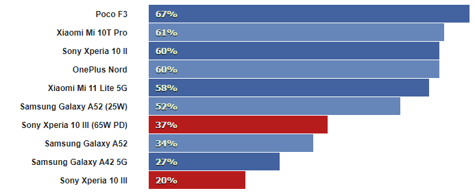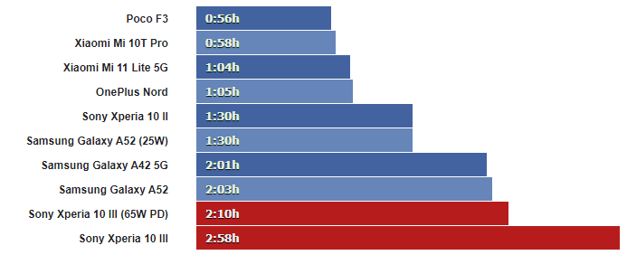 Мы рассчитали скорость зарядки Xperia 10 III как с помощью прилагаемого адаптера, так и с помощью хорошего стороннего адаптера, максимальная мощность которого составляет 65 Вт и который также поддерживает PPS. Включенному устройству потребовалось три полных часа от разряда до полной зарядки, при этом на индикаторе батареи на полчасовой отметке показывались только 20%. С адаптером PD дела обстоят немного лучше – он довел нас до 37% за полчаса и потребовалось 2:10 часа для полной заправки. В любом случае, Xperia – самый медленный телефон в своем классе, будь то с адаптером в комплекте или сторонним.