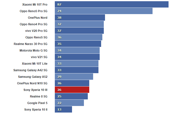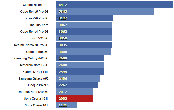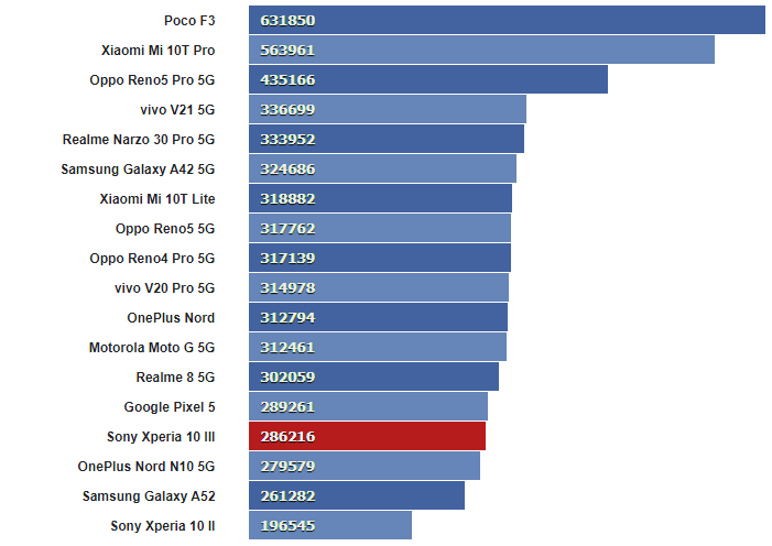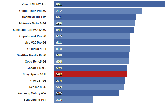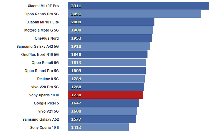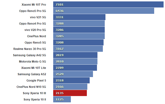 В Antutu Xperia 10 III сохраняет свои позиции позади большинства устройств среднего класса 5G – чип находится в пределах 10%, но не совсем соответствует Snapdragon 700.
