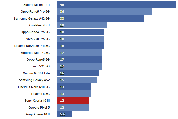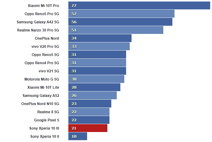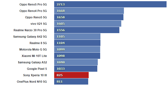 В GeekBench Xperia примерно сравним с другими телефонами среднего уровня с поддержкой 5G, использующими SD690 (OnePlus Nord N10 5G), в то время как устройства SD750 и SD765 имеют небольшое, хотя и в значительной степени несущественное преимущество. Xperia, в свою очередь, немного мощнее устройств с Dimensity 800U, такого как vivo V21 5G. Возможно, вы сможете получить Xiaomi Mi 10T Pro в рамках того же бюджета, что и Xperia, а его SD865 – гораздо более страшный зверь.