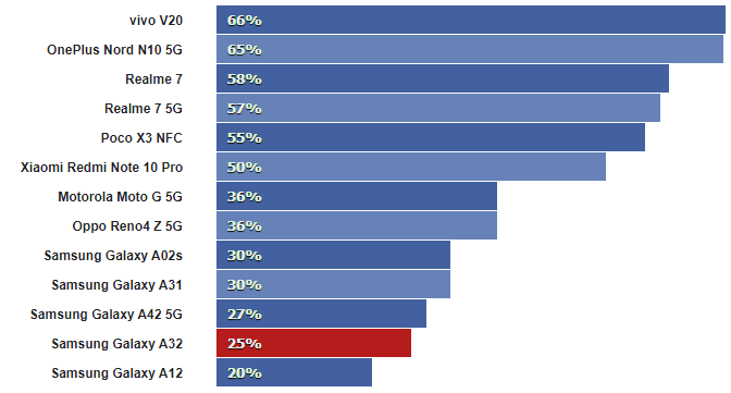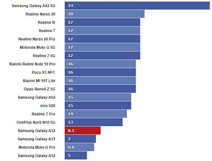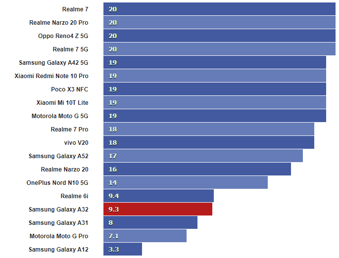 ↑Как и большинство других не флагманских моделей Samsung, Galaxy A32 имеет один динамик, расположенный в нижней части телефона. И, как и большинство других не флагманских моделей Samsung, он относительно тихий – A32 получил оценку «Ниже среднего» по громкости в нашем 7-трековом тесте. Практически все конкуренты выдают больше децибел, а у некоторых есть стереодинамики (Redmi Note 10 Pro и Poco X3).