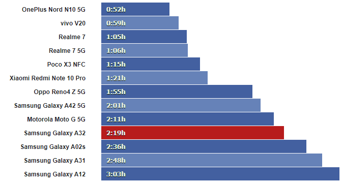 Действительно, Galaxy A32 показал отличные результаты по времени автономной работы. Запустив телефон в режиме 90 Гц, мы измерили 16 часов просмотра веб-страниц по Wi-Fi и 18 часов автономного воспроизведения видео. С более чем 33 часами голосовых вызовов и приличным числом в режиме ожидания Galaxy A32 показал рейтинг выносливости 119 часов.