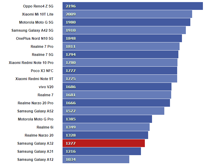 У ЦП есть два ядра Cortex-A75, которые могут выдавать приличные числа для более требовательных операций, но большинство конкурентов используют конструкции, основанные на более новом A76, и они часто работают с тактовой частотой выше 2,0 ГГц в чипсете G80. Таким образом, результаты Galaxy A32 показывают, что он не совсем рядом с результатами конкурентов в GeekBench. Это незначительное улучшение по сравнению с Galaxy A31, но Galaxy A32 заметно уступает A52 и большинству других телефонов, которые вы можете получить за эти деньги.