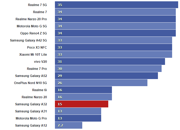 Результаты тестов подтверждают то, что мы уже ожидали – чипсет Galaxy A32 неконкурентоспособен. Телефон, строго говоря, не медленный, а частота обновления 90 Гц действительно обеспечивает плавность работы. Тем не менее, при перемещении по пользовательскому интерфейсу случаются случайные лаги, разблокировка находится на медленной стороне спектра, а обработка в ночном режиме занимает некоторое время. В целом, телефон выиграл бы от лучшего чипсета, но нельзя уместить сразу всё в определенный бюджет.