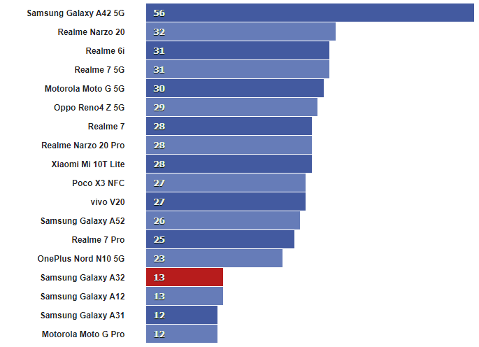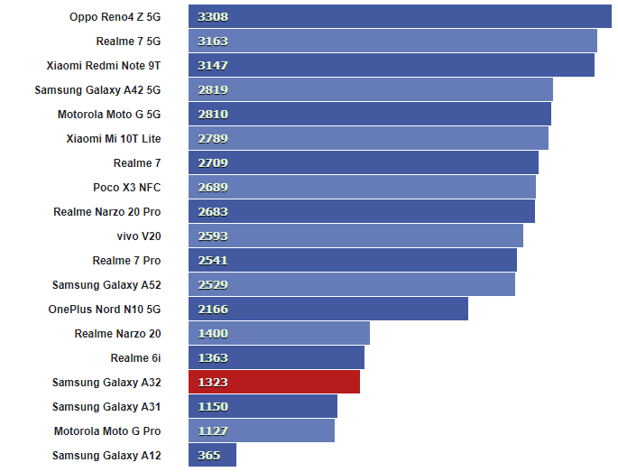Результаты Antutu в значительной степени отражают результаты GeekBench только для ЦП. A32 значительно мощнее A12, но он не сравнится с Snapdragon 720 или Dimensity 800.