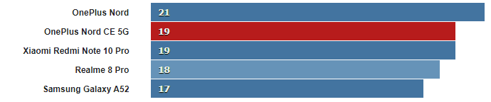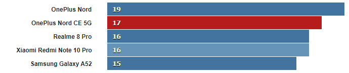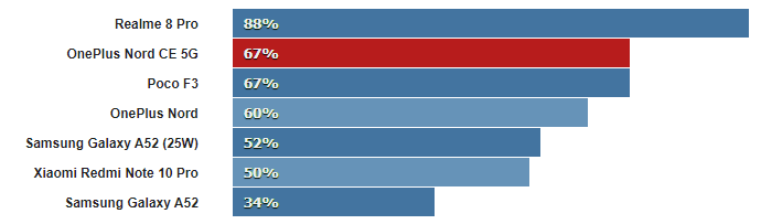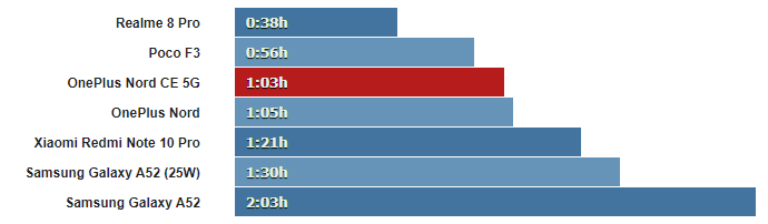 ↑Честно говоря, поначалу мы были немного скептически настроены, учитывая аккумулятор емкостью 4500 мАч. Тем не менее, Nord CE удалось удивить отличной автономностью во всех тестах. Он особенно хорошо показал себя в тестах с включенным экраном, которые, возможно, являются более важным аспектом выносливости батареи. Время воспроизведения видео и время просмотра веб-страниц выше, чем у любого из его прямых конкурентов, и в результате OnePlus получает впечатляющий общий рейтинг 117h.