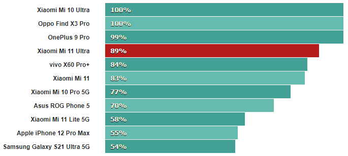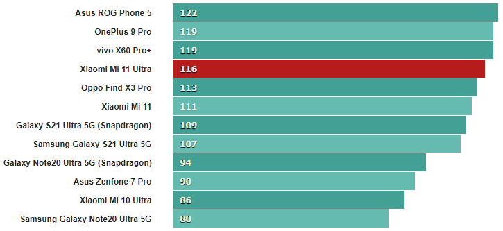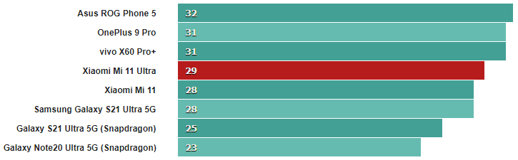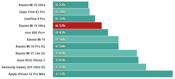 Мы проработали около 11 часов в режиме просмотра веб-сайтов по Wi-Fi на Mi 11 Ultra, практически так же, как и на Mi 11. Мы получили такую же долговечность голосовых вызовов – 28 часов. При автономном воспроизведении видео Mi 11 Ultra проработал 15 часов, на час больше, чем Mi 11. В конечном итоге выносливость Mi 11 Ultra достигла 95 часов – хуже Galaxy, но лучше, чем Find X3 Pro и OnePlus 9 Pro.