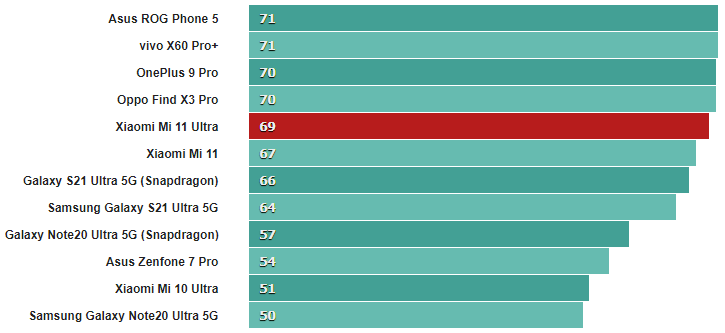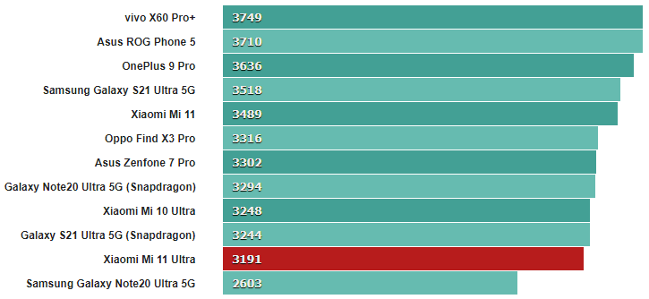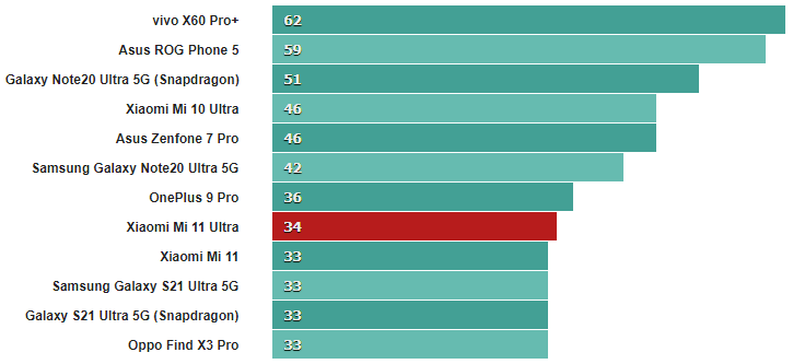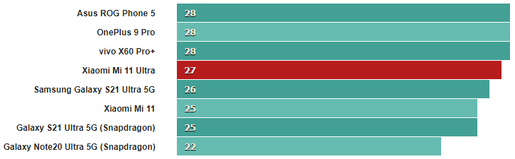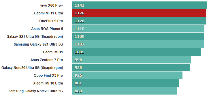 Наши тесты показали довольно консервативную настройку Ultra по сравнению с более высокими показателями SD888, которые мы накопили за это время, такими как OnePlus 9 Pro и vivo X60 Pro+. Тем не менее, цифры Mi 11 Ultra по большей части соответствуют собственно Mi 11. Мы только заметили явную разницу в многоядерном тесте GeekBench, ориентированного на ЦП, где Ultra показал почти на 10% меньшие оценки, чем не-Ultra, и необычно низкий результат для SD888. С другой стороны, одноядерный тест дает Ultra преимущество над своим товарищем, а также ставит его на первое место.