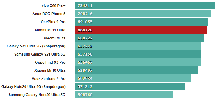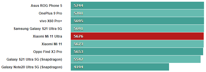 Есть небольшая разница между моделями Mi 11 в Antutu 8. Mi 11 Ultra удалось превзойти Find X3 Pro и Galaxy S21 Ultra, как в отделке Exynos, так и в Snapdragon. Рисунок OnePlus 9 Pro практически такой же, как у Mi.