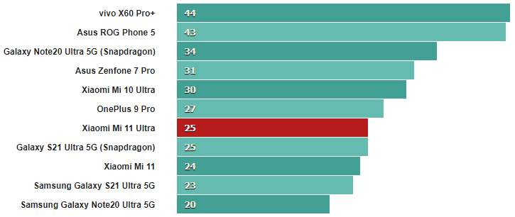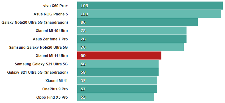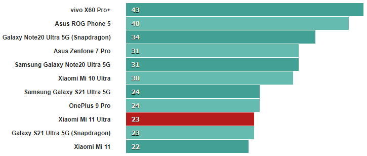 И OnePlus 9 Pro, и Find X3 Pro немного быстрее в обеих дисциплинах, как и Mi 10 Ultra. Между тем, Galaxy S21 Ultra далек от показателей Mi.