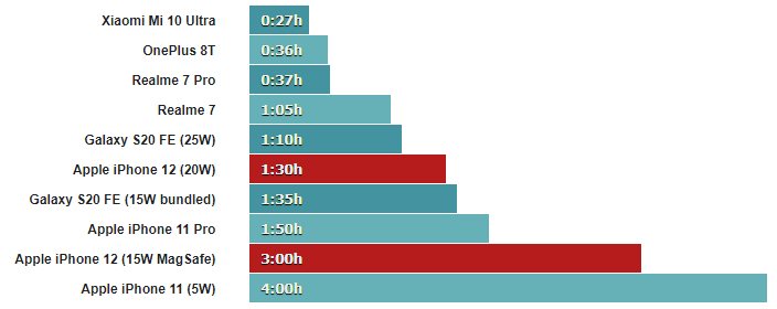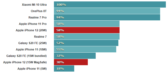 Если вы зарядите свой разряженный iPhone 12 зарядным устройством Apple на 20 Вт, он зарядит 58% батареи за 30 минут.