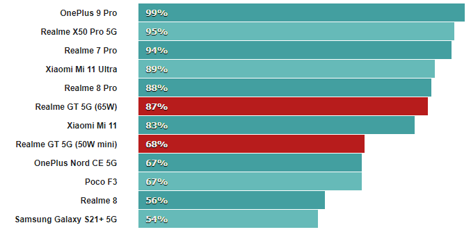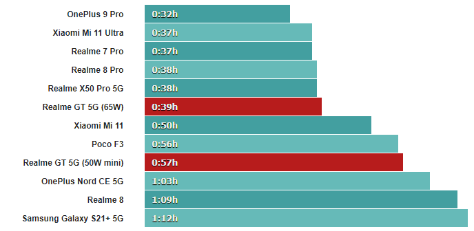 Realme GT показал рейтинг выносливости 98 часов в нашем тесте на время автономной работы. В звонках 3G он может работать целый день; вы можете просматривать веб-страницы почти 14 часов или смотреть видео более 16 часов. Показатели в режиме ожидания оказались одними из лучших, которые мы видели у смартфона на SD888.
