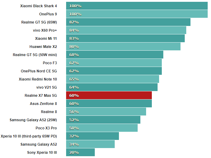 Следует отметить одну интересную вещь: Realme GT по-прежнему заряжается немного быстрее при использовании зарядного устройства на 50 Вт. Мы предполагаем, что снижение скорости зарядки как-то связано с другим набором микросхем. В любом случае Realme X7 Max 5G (GT Neo) хорошо справляется с зарядкой, пусть его батарея на 4500 мАч и не самая большая в мире.