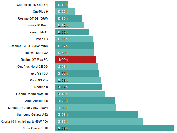 ↑В Realme X7 Max 5G (GT Neo) установлена батарея емкостью 4500 мАч – не особо мощная, но все же вполне приличная, особенно учитывая относительно компактные размеры телефона. Мы уже видели, что линейка чипов MediaTek Dimensity довольно хорошо справляется с тестами батареи. Конечно, наш опыт в основном состоит из чипов серий Dimensity 700 и 800, поэтому нам было очень интересно увидеть, как покажет себя первоклассный Dimensity 1200. В конце концов, он основан на эффективном 6-нанометровом производственном процессе.