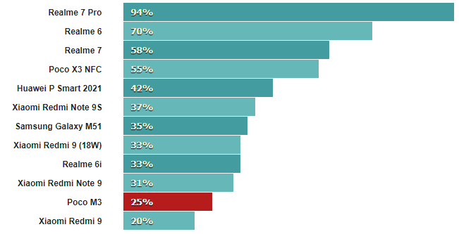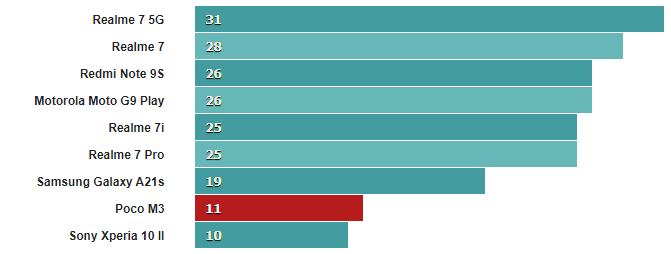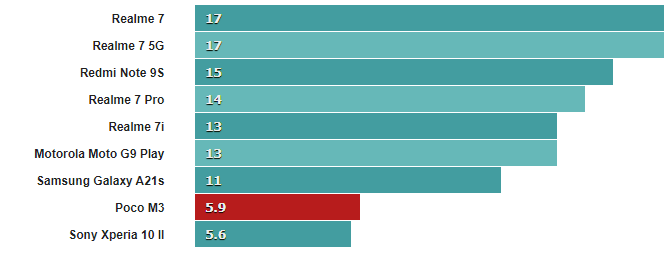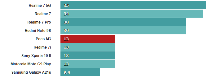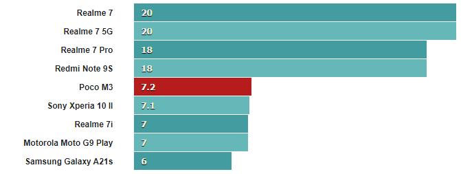 Экранные тесты показывают превосходство телефонов с экранами 720p, таких как Realme 7i, Galaxy A21s и Moto G9 Play, над Poco M3.