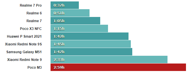 Poco M3, как и следовало ожидать, показал выдающийся результат в нашем тесте батареи с 154-часовым рейтингом выносливости – он занял третье место в нашем графике времени автономной работы за все время. Он отлично справился со всеми сценариями тестирования – воспроизведение видео, звонки, просмотр веб-страниц и продемонстрировал длительную производительность в режиме ожидания.