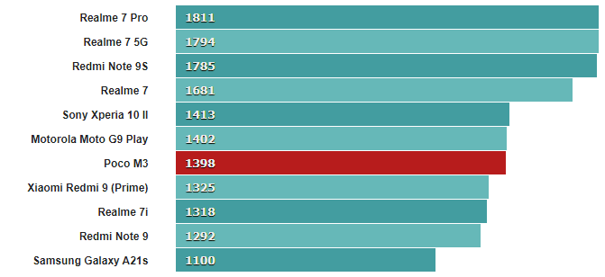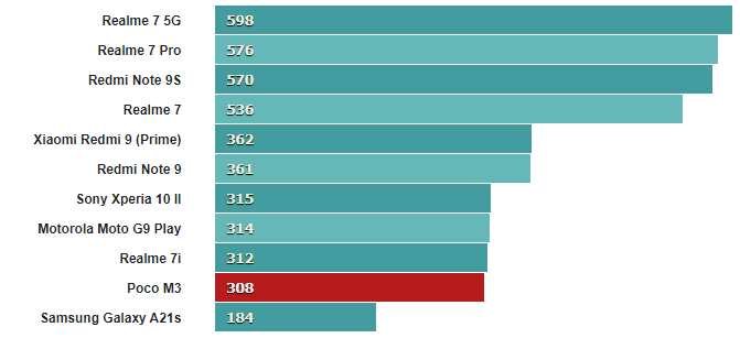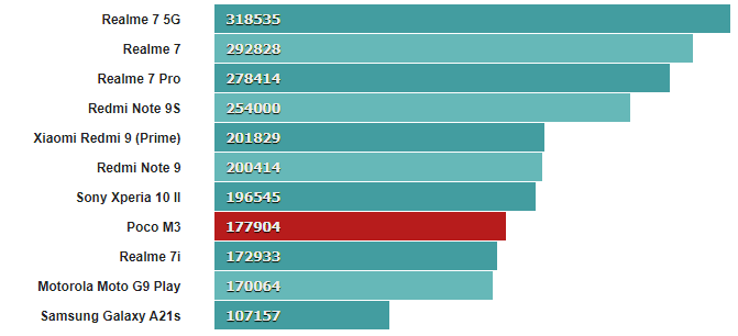 И вот как Poco M3 сочетается с конкурирующими телефонами с разными SoC.