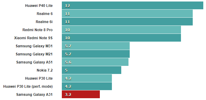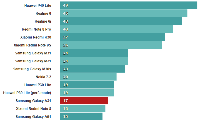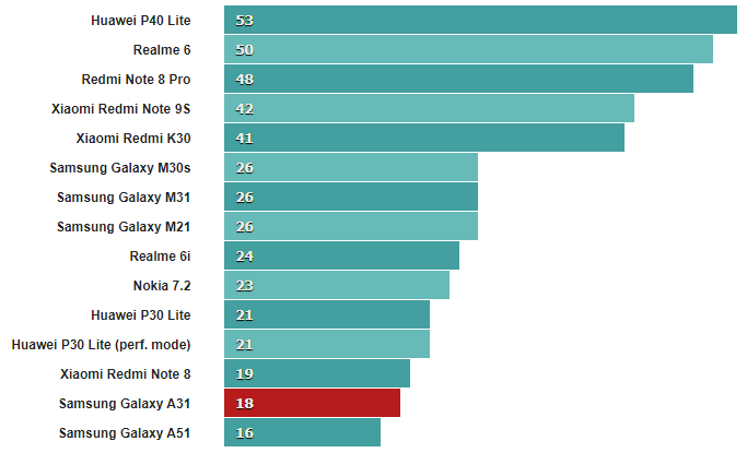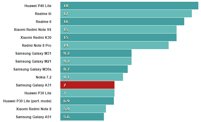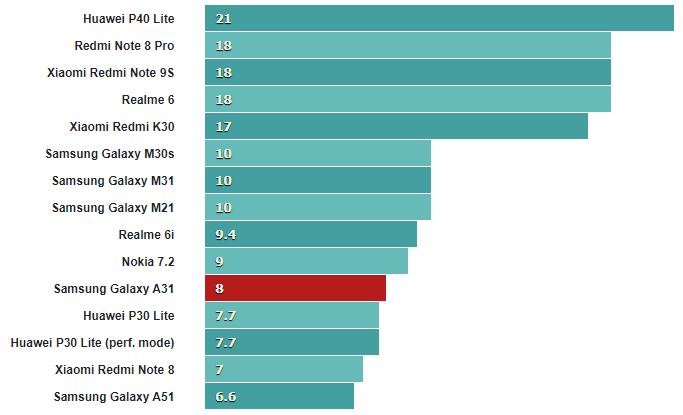 Переходя к более сложным показателям производительности и AnTuTu 8, мы, к сожалению, находим Galaxy A31 в нижней части списка. Это можно объяснить, по крайней мере частично, тем фактом, что наш обзорный смартфон является базовой конфигурацией с 4 ГБ ОЗУ и 64 ГБ памяти. AnTuTu принимает во внимание память и особенно ее скорость. Возможно, более крупные, опциональные микросхемы ОЗУ на 6 ГБ на A31 были бы лучше. То же самое верно и для внутренней памяти 128 ГБ, поскольку твердотельные накопители обычно имеют лучшую производительность по мере увеличения их емкости. Тем не менее, стоит отметить, что Galaxy A31 использует для хранения данных eMMC 5.1, в отличие от UFS 2.0, как в Galaxy A51. Последний стандарт обычно быстрее.