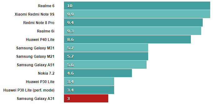 Единственное логическое объяснение, которое мы можем придумать, – это некоторая проблема с текущим состоянием драйверов графического процессора Helio P65. Либо это, либо Galaxy A31, в частности, сильно наталкивается на какое-то другое узкое место в аппаратном обеспечении во время всех этих тестов графического процессора, что приводит к снижению результатов. Мы не решаемся напрямую обвинять графический процессор Mali-G52 MC2, поскольку он также присутствует в Xiaomi Redmi Note 9 или Realme 6i и работает заметно лучше в составе их соответствующих чипсетов Helio G85 и Helio G80.