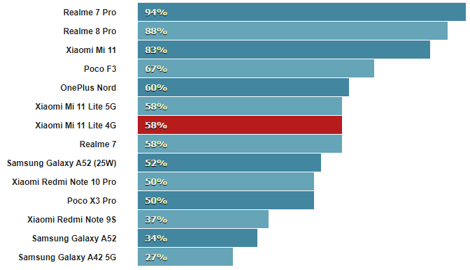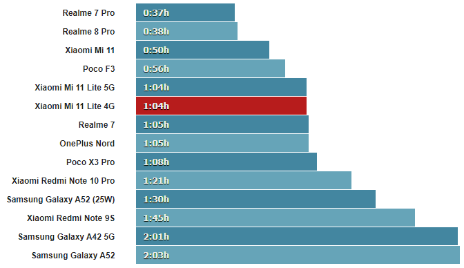 Для полной зарядки требуется чуть больше часа, а точнее 64 минуты. Это довольно быстро, но давайте не будем забывать, что Mi 11 Lite имеет аккумулятор емкостью 4250 мАч для подзарядки, в то время как многие устройства в нашей таблице используют элементы емкостью 5000 мАч.