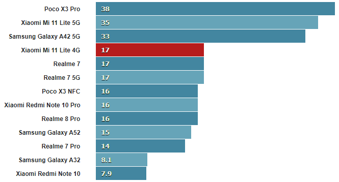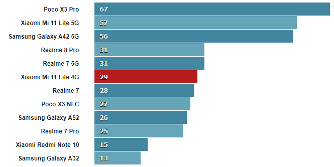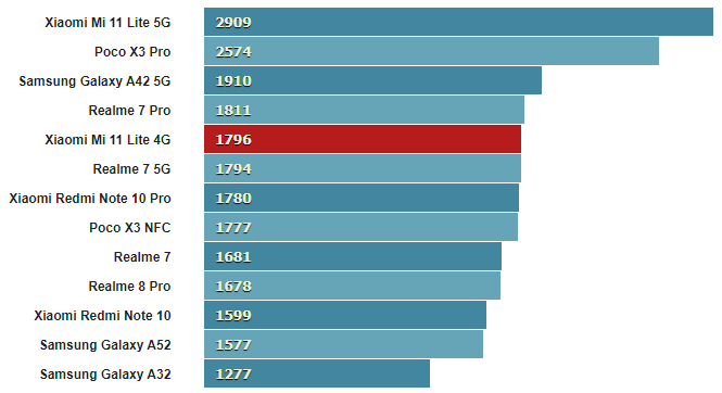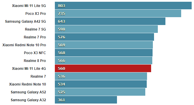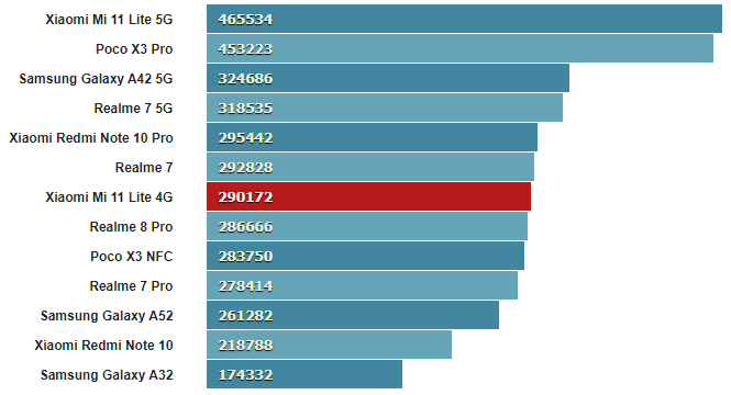 Тест AnTuTu ставит Mi 11 Lite в один ряд с Redmi Note 10 Pro, Poco X3 NFC, Realme 8 Pro и Realme 7. Это хорошо оборудованный телефон для этого класса.