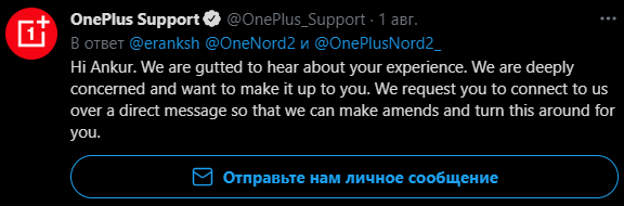 Вскоре после публикации твита, OnePlus прибыла в Twitter со следующим ответом: